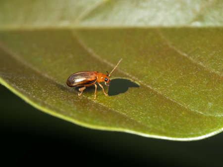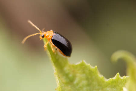 Orange,red beetle with a beautiful color grasping the green leaves in the natural garden.