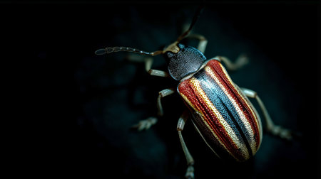 A vibrant beetle with colorful stripes crawls on a dark surface, showcasing its intricate patterns