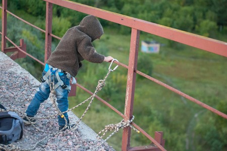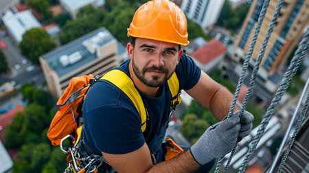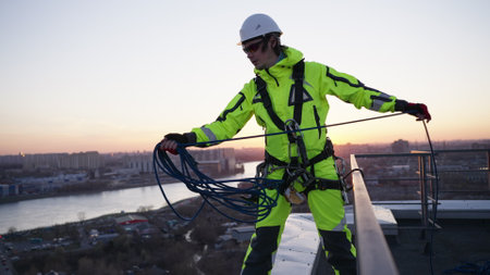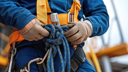 A skilled worker emphasizes safety while securing a rope in a harness at a construction site, showcasing the essential safety measures and techniques for high-risk jobs.