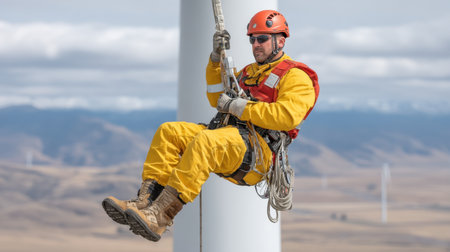 A skilled energy engineer performs an inspection on a wind turbine, showcasing safety gear and high altitude techniques essential for renewable energy maintenance.