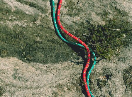 Sport climbing rope on rock. Used colorful nylon ropes without load
