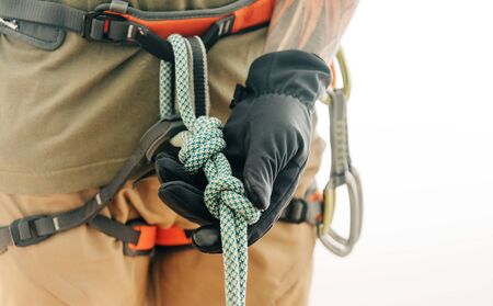Unrecognizable sporty man climber in safety harness holding rope knot eight indoor, close-up.