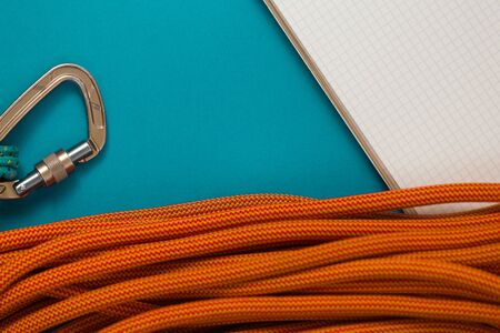 Notepad and climbing equipment on a blue background. Desktop. Preparing for the trip. Carabiner and rope.