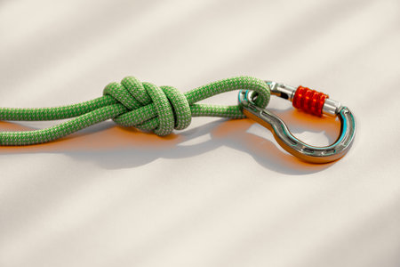 Rope with a secure knot and carabiner. Equipment for rock climbing and mountaineering. reliable connection. Safety rope. concept of reliability and durability.