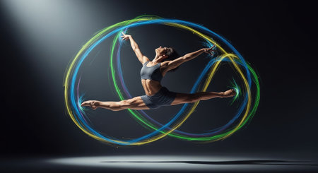 A graceful dancer is captured mid-air, performing a split with arms outstretched. The image showcases a dynamic composition with swirling trails of light in various colors. The studio shot utilizes dramatic lighting and a dark background. Suitable for conceptual illustrations or commercial projects.