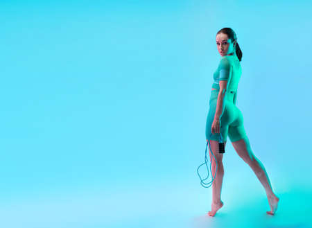 Young sportive woman training with skipping rope isolated on gradient studio background in neon light. Modern sport, action, motion, youth concept. Beautiful caucasian woman practicing