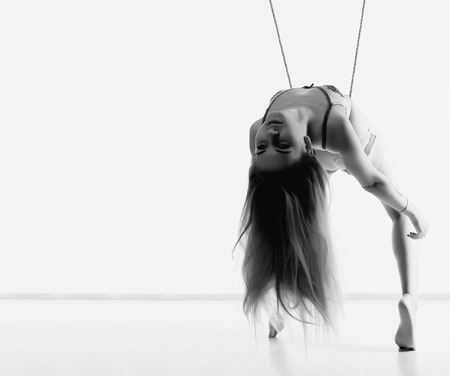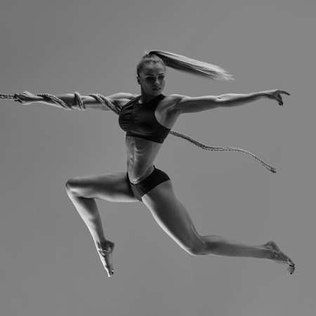 Young woman gymnast on rope on white , Black and white