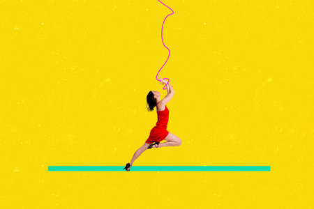 Contemporary artwork banner collage of astonished girl wear handcuffs marionette control ribbon