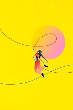 Template poster trend 3D photo collage of line abstract copyspace young woman jump sport determination warmup fitness athlete practice
