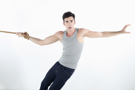 Man with hand tied to a rope, pulling hard