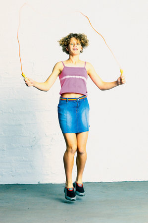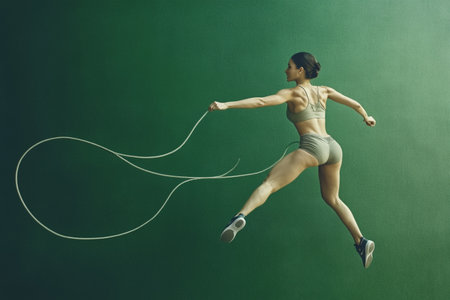 Young sporty woman jumping with skipping rope on dark green background.