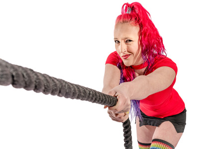 Woman with red hair and short skirt pulls on a rope
