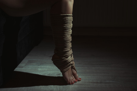 Beautiful legs tied with rope in bondage. Photo toning.