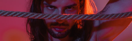 Long haired man looking at camera near rope on purple background with light, banner