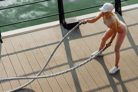 Fitness woman using training ropes for outdoor sports on the pier, Sportswoman exercising with fighting ropes, Sport concept, healthy lifestyle