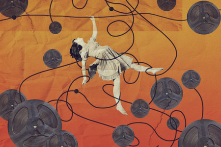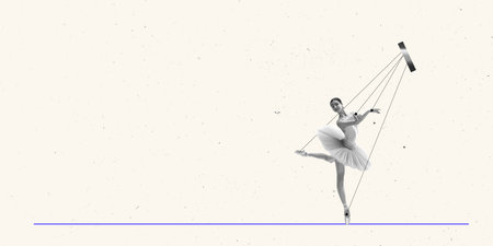 Contemporary art collage. Young girl, ballerina performing on beige background. Tender