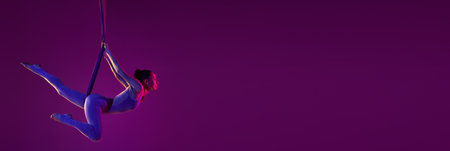 Stretching. Young flexible girl doing aerial yoga, training over purple studio background in neon light. Concept of fitness and healthy lifestyle. Banner
