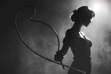 A woman is holding a whip and standing in front of a light. The image has a dark and mysterious mood, with the woman's silhouette and the smoke in the background