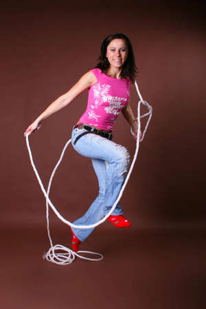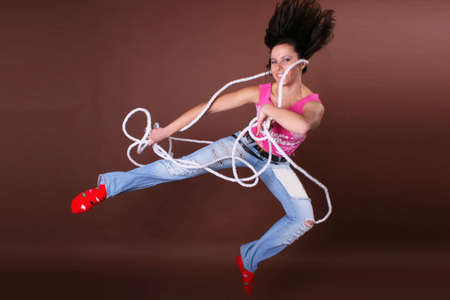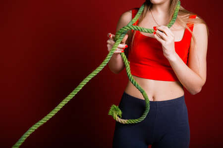 A beautiful young woman doing gymnastic exercises with a rope