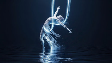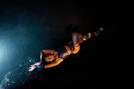 Young woman dancing in water with light beam on her head. Mixed media