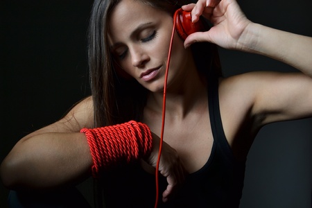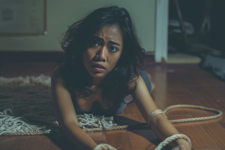 Young beautiful Asian woman tied up in a rope on floor at home