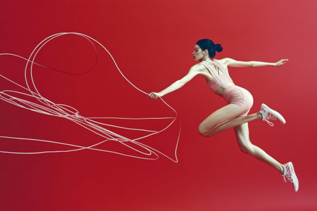 A female ballet dancer jumping with a white line on a red background