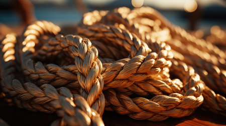 A beautifully captured close-up of twisted rope with soft sunlight illuminating its texture against a serene nautical background, invoking a sense of adventure.