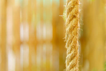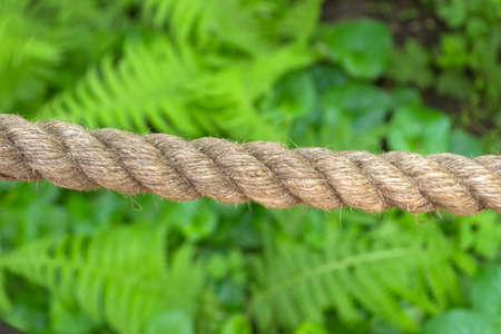 Horizontally stretched thick rope made from natural fiber close-up against a background of green plants