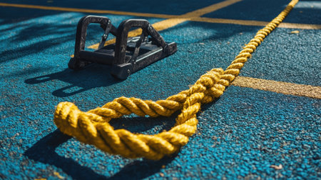 A vibrant scene showcasing a yellow training rope laid out on a blue gym surface next to a black sled, perfect for fitness enthusiasts and strength training.