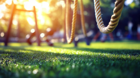 A captivating close-up view of playground ropes, softly illuminated by the golden hues of sunset, highlighting vibrant green grass in a serene park.