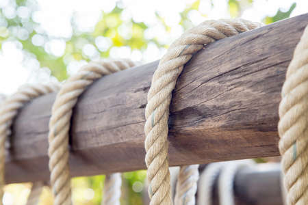 selective focus image,Group knot of rope in wooden bridge.