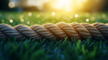 Close-up of a thick rope on grass with blurred sunlight background, tranquility and strength concept