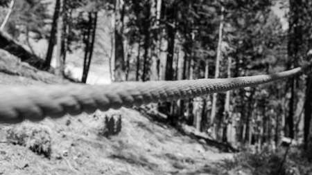 Rope holding a log bridge, part of the cableway. Close-up. Extreme sport.
