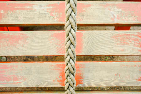 Old rope on background of distressed red painted wood planks