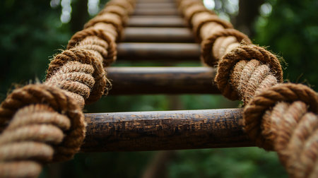 Detailed view of a sturdy, natural fiber rope ladder, showing the intricate braiding of the thick ropes and weathered wooden rungs.