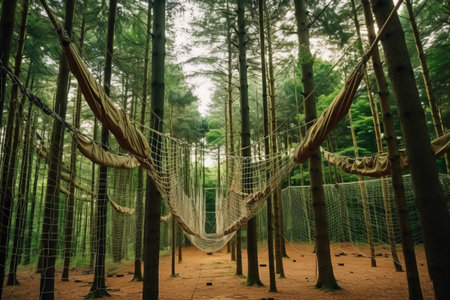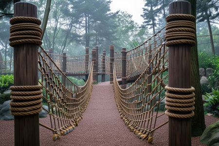 A rope bridge extending across a lush forest, offering a safe passage for people to cross, An adventurous playground interconnected with rope bridges, AI Generated