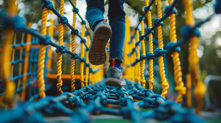 Close-up of a child's legs walking through a rope park