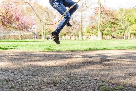 Girl playing jumping rope in a park in summer.