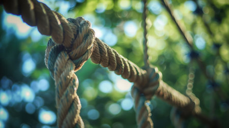 This image showcases a close-up view of a rope knot against a blurred natural background. The sunlight illuminates the textures of the fibers, emphasizing craftsmanship and strength in outdoor environments.