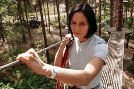 The bridges, ropes and ladders of the Adventure Park are designed for beginners among the tall trees. Adventure climbing in a high rope course. Rope track in the city park