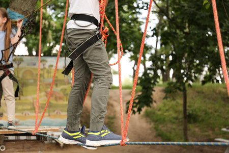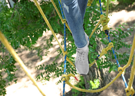 Child climbing in adventure park, closeup. summer camp