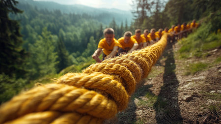 A group of individuals, bound by teamwork and determination, face a challenging outdoor environment With grit and resolve, they pull together on a rope, their united effort symbolizing their shared pursuit of success Their struggle against the elements reflects their resilience and unwavering commitment to achieving their goal AI Generative