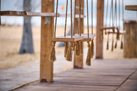 Many swings made of wooden board and tied with rope hang on cable over a small stream flowing through a tropical green rainforest. Swing hanging high and frightening above the river. Selective focus.