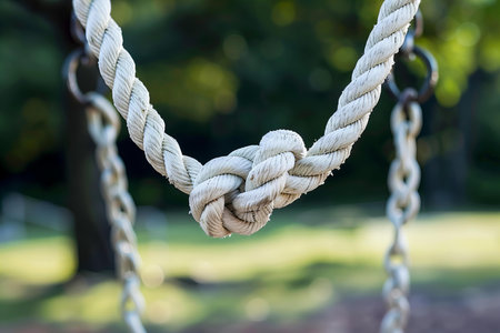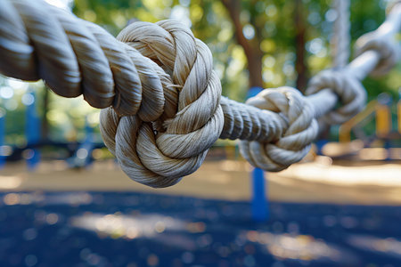 Closeup of white rope with knot on playground, blurred background. close up of old natural rope in a park. a macro shot of an intricate knot. argumentative concept photo about the importance and power of trust, connection between people, for social or political messages. k, real photography, sony al