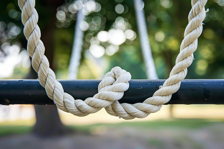 Depicting a closeup of white rope with knot hanging on park swing, blurred background. the rope was tied in a knot and hanging on the park swing with a blurred background.