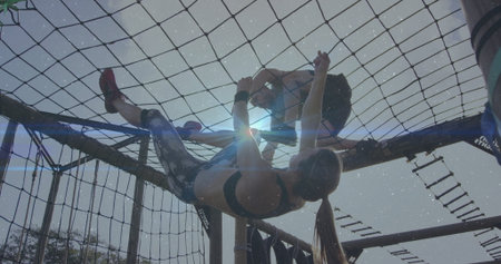 Climbing duo wearing sportswear hanging on cargo net while partner steadying at obstacle course. Adventure, teamwork, outdoor, strength, endurance, athleticism, active