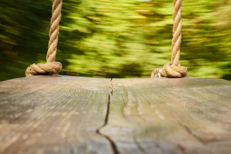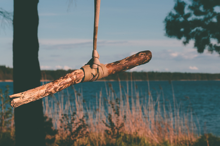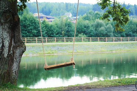 Wooden swing on a rope mount mounted on a tree on the shore of the lake.