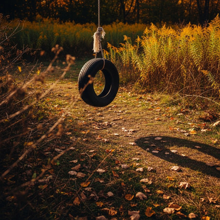 An empty rope swing hangs from a majestic oak tree, silhouetted against a breathtaking golden sunset.
