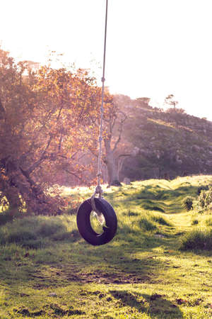 View of a mountainous country side with a old tyre swing hanging from a tree, surrounded with trees and dry grass, Cape Town, South Africa.