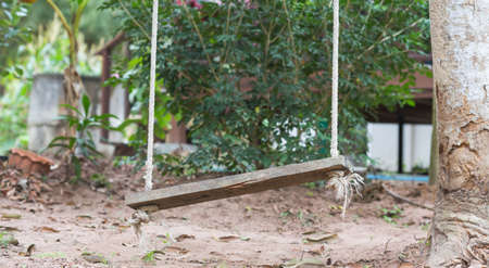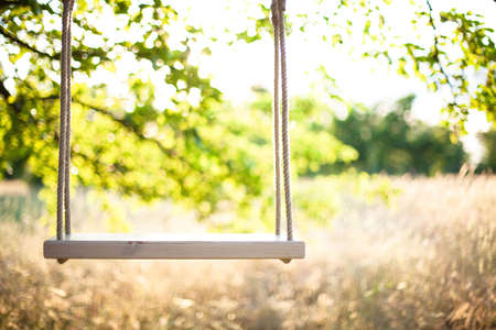Children's swing fixed on the ropes against the backdrop of the setting sun day